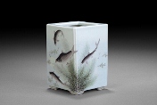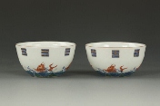 大清 道光年制款 鬥彩八卦鯉魚杯一對