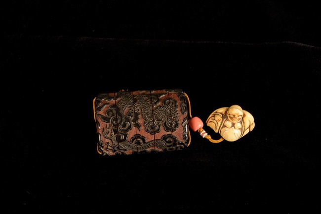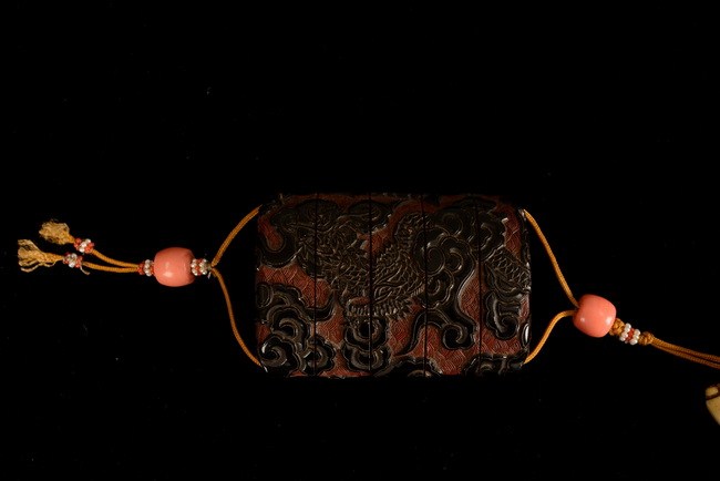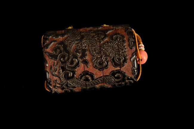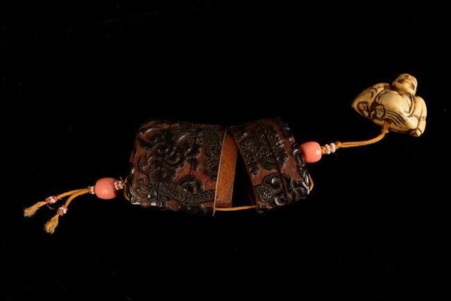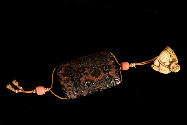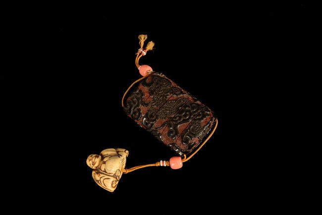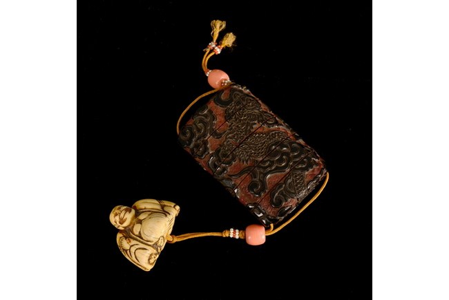 A well carved Japanese lacquer ornament of two colors, with red color wave form background, and a dragon. It can be opened for storage purposes. It is completed with a carved netsuke and coral/pearl beads. W: 2 3/4 in (7 cm), H: 3 1/2 in (9 cm)