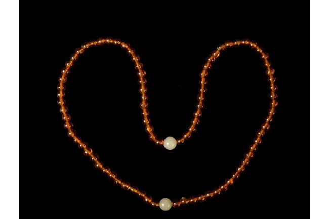 The strand of amber prayer beads include 88 similar sized amber beads, and two larger white beads.