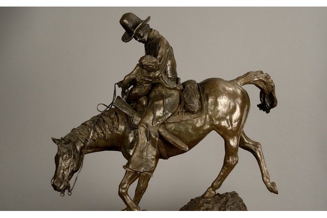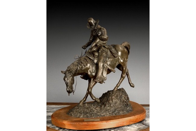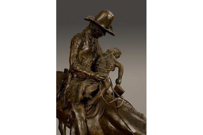A cast bronze sculpture depicting a cowboy riding a horse, and carrying a wounded child, descending on a slope. It is completed with a wood base, which has a plaque signifying the title of the piece as "The Ride For Life", and the sculptor Bob Wood, manufacture date 1981.