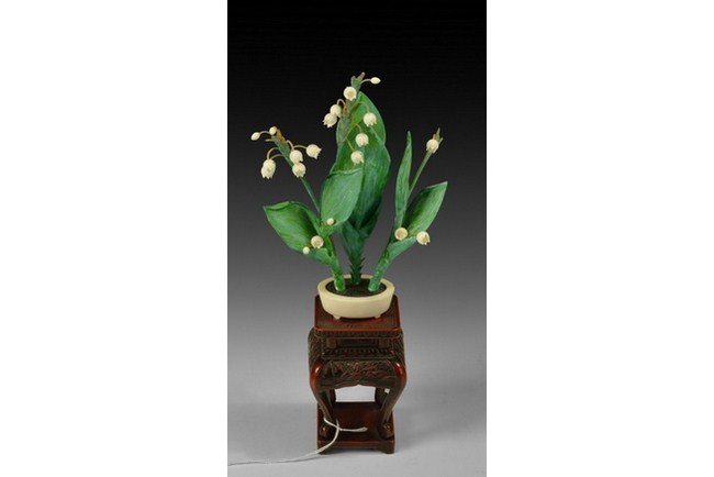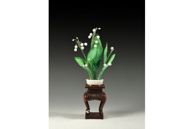 The ivory carved narcissus flower planter has three main stems, with six separate leaves, fifteen blooming flowers, and five bulbs. The stand is made of carved lacquer, depicting a round flower stand.