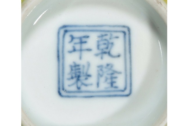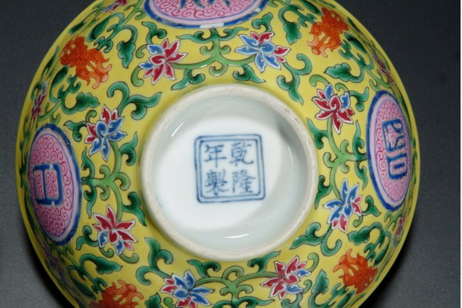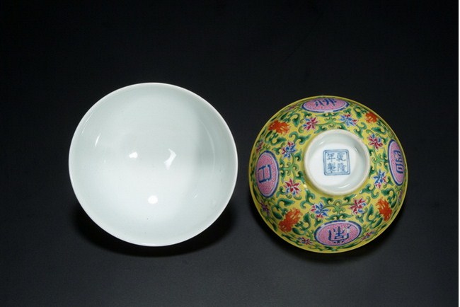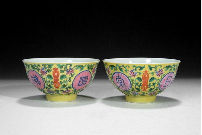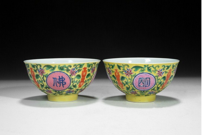 A pair bowls with enameled Buddhist design, and four characters are "FO RI CHANG MING". The clear glazed base bears a four character "QIANLONG" mark. Qing Dynasty period.