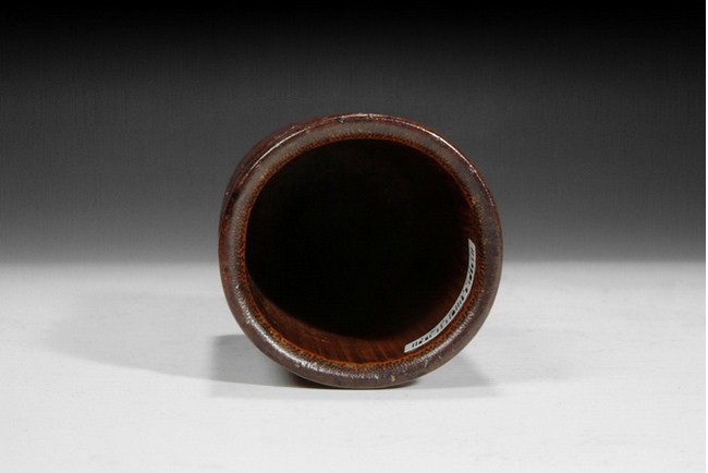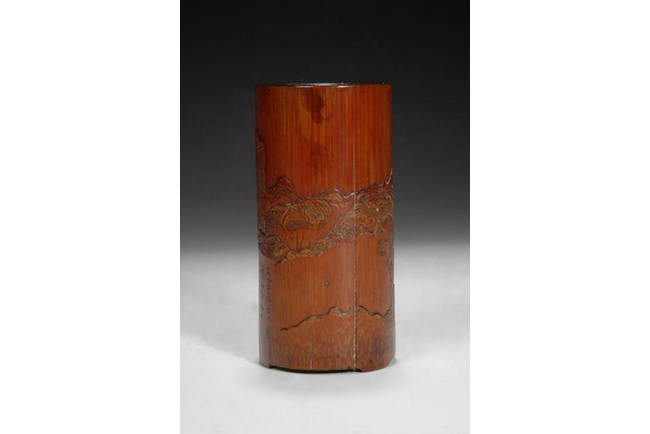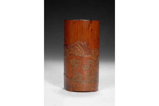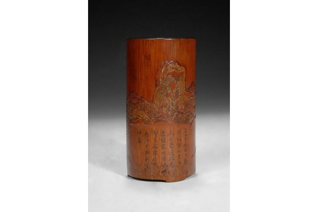 The bamboo brush pot was well carved with a continuous landscape scene, and the side bears a six column inscription, along with carver's signature. Qing Dynasty period.