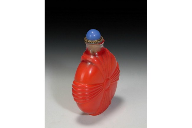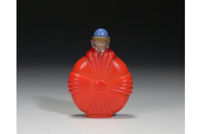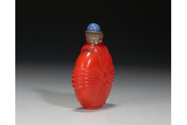 The glass snuff bottle with the body simulating color of red coral and is topped with a glass stopper. Republic period.