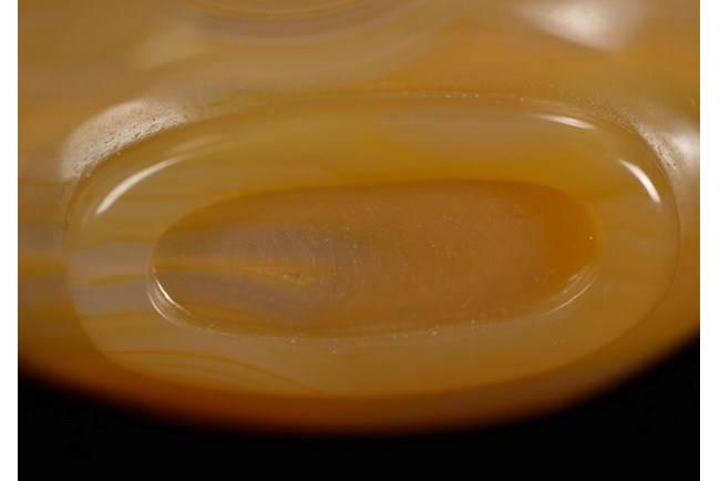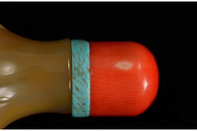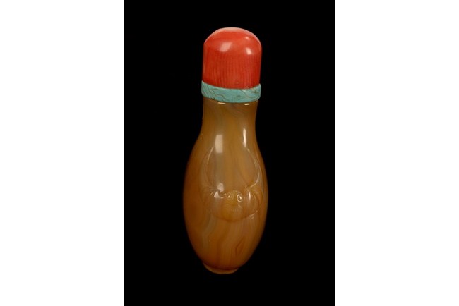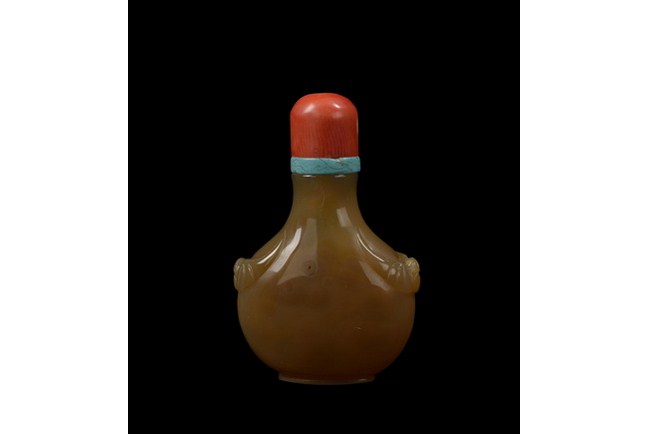 An agate snuff bottle carved with two bat handles and topped with a turquoise and coral stopper. Qing Dynasty period.
