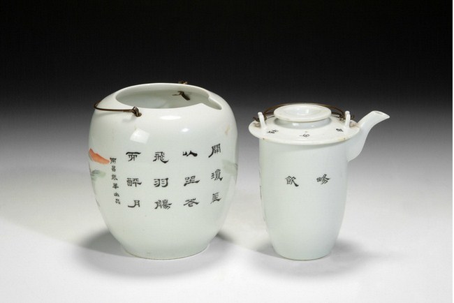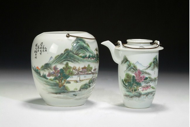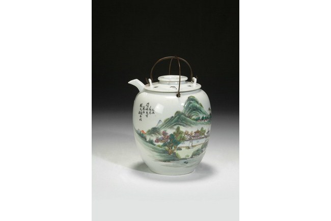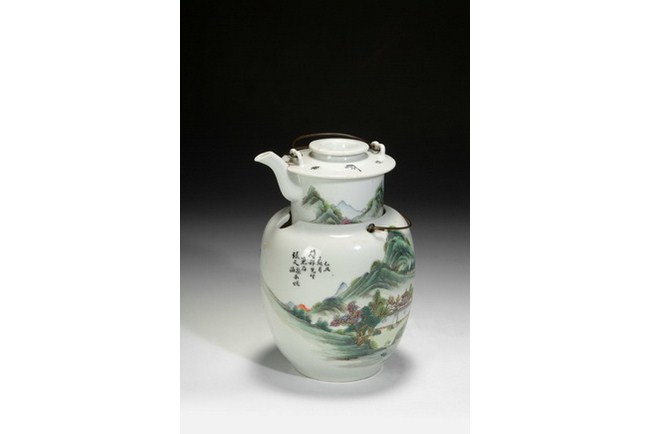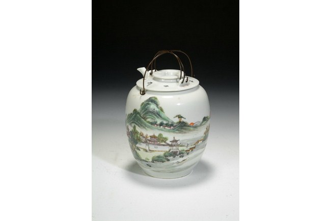 A Chinese wine pot manufactured by "JIANGXI TAOYE GONGSI", and decorated with famille rose landscape design. It is completed with the en suite warmer and cap. Republic period.