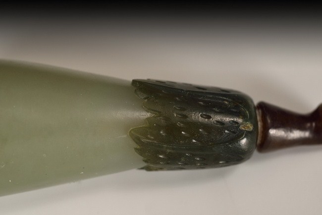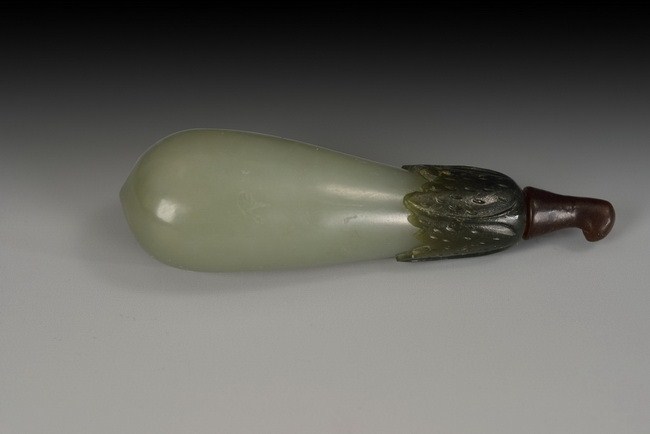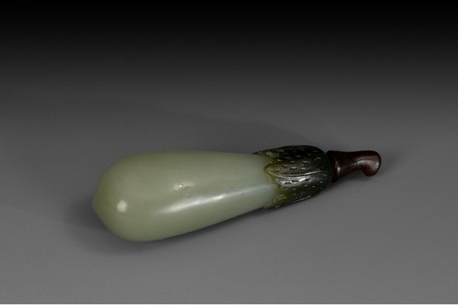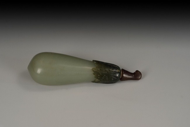 A carved jade snuff bottle in the shape of eggplant. It is completed with a stone stopper. Qing Dynasty period.