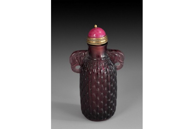 A purple color glass snuff bottle with a pair of elephant ears and topped with a stone stopper. Republic period.