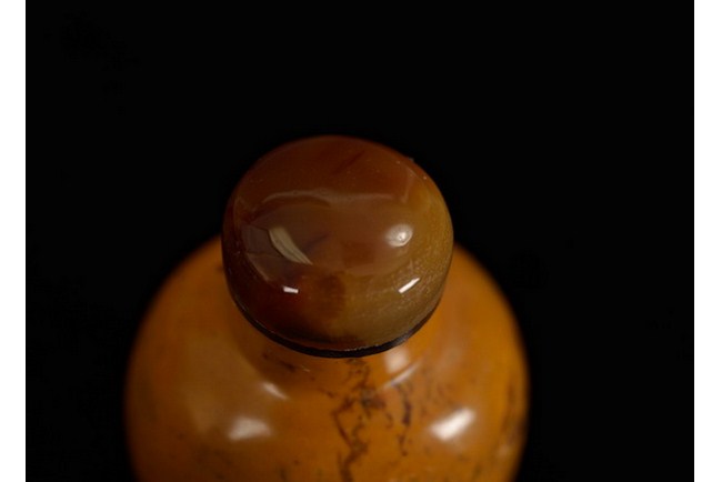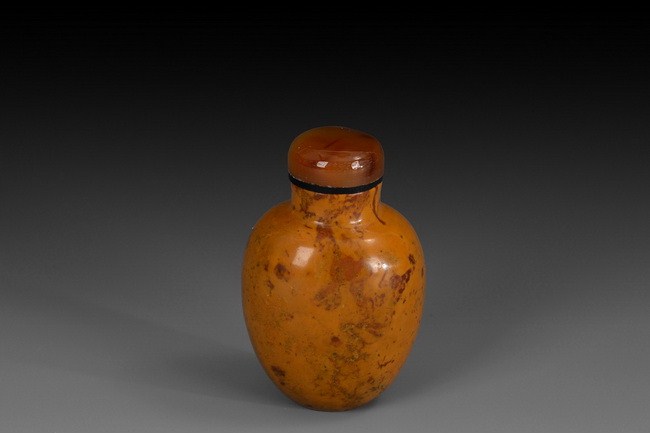 A Shoushan stone snuff bottle carved in a plain bulbous form, and topped with an agate stopper. Qing Dynasty period.