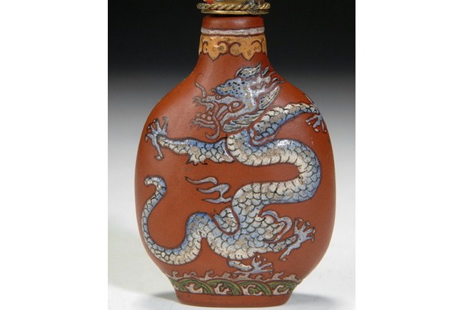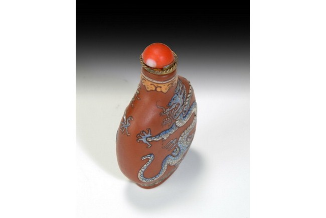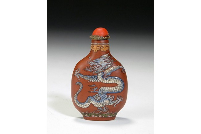 A Zisha snuff bottle decorated with five clawed dragon on both sides, and topped with a imitation coral stopper. Qing Dynasty.