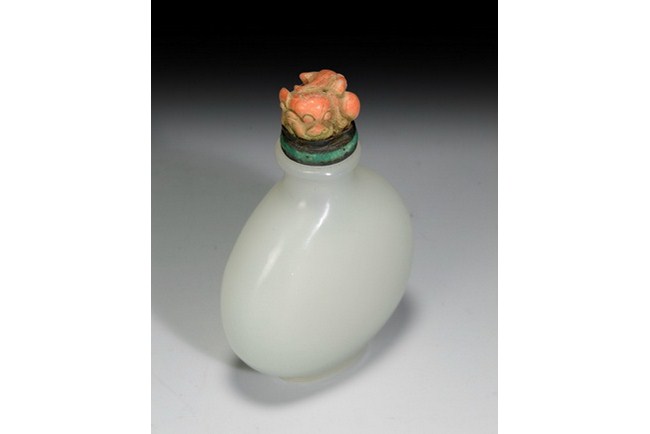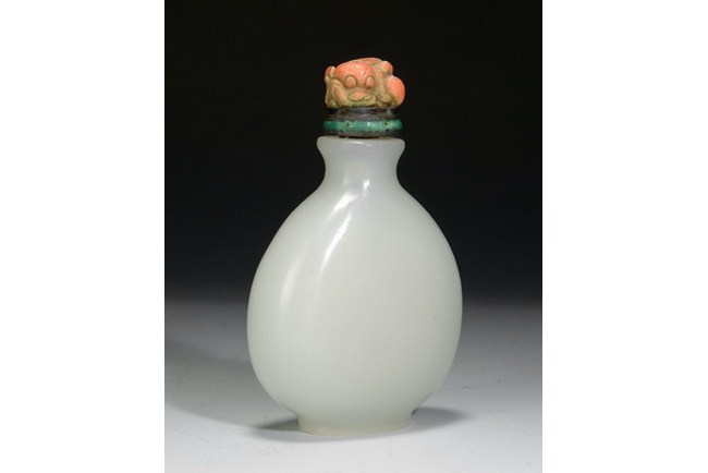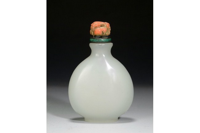 A white jade snuff bottle of plain design, topped with a coral stopper. Qing Dynasty period.