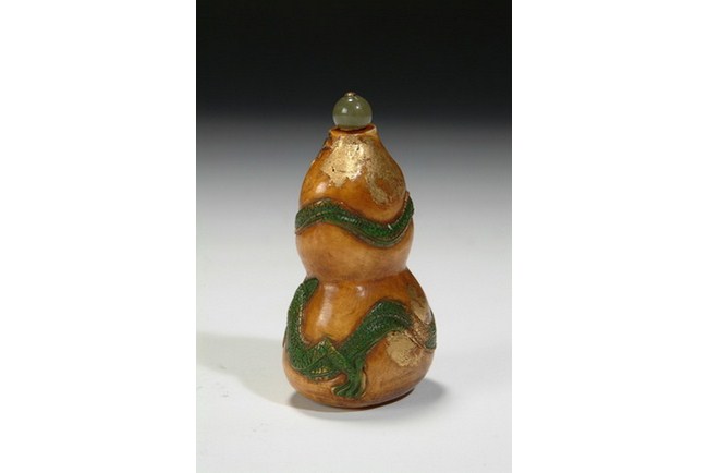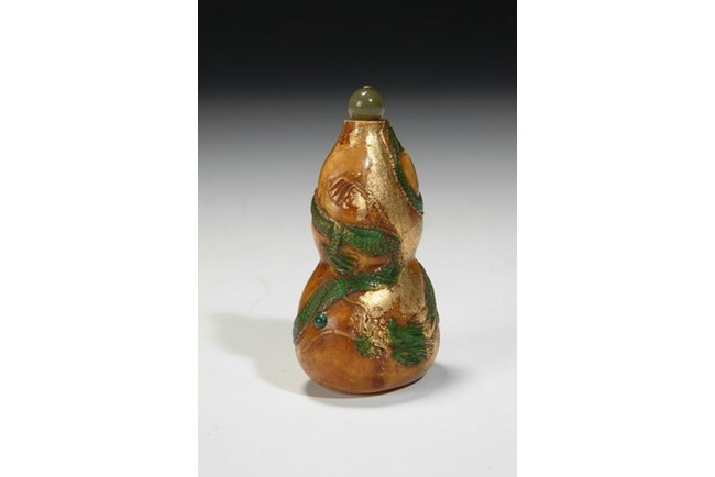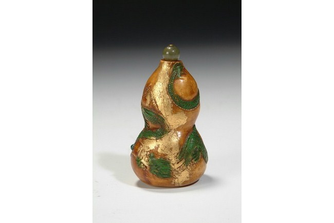 A carved ivory snuff bottle with the design of the dragons among patches of gilt accent, topped with a jadeite stopper. Republic period.