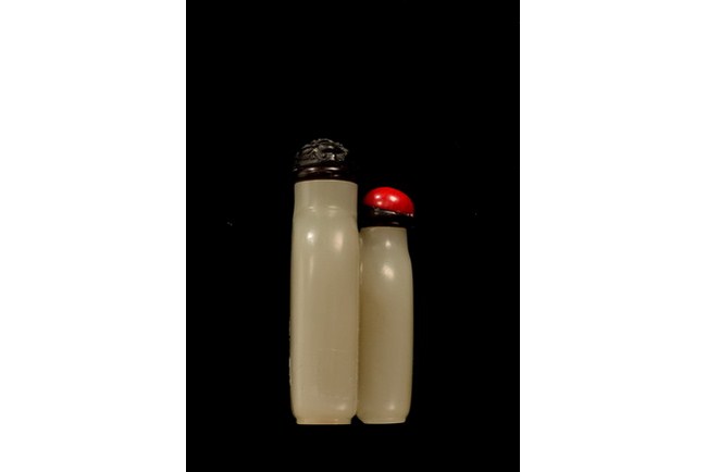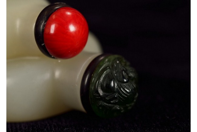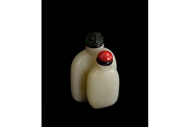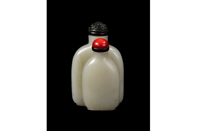 A snuff bottle carved as a twin bottles of plain design, and topped with stoppers of different materials. Qing Dynasty period.