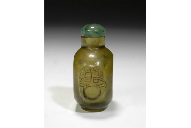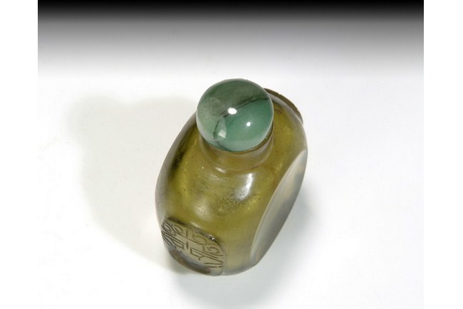 A glass snuff bottle topped with a hard stone stopper. Republic period.