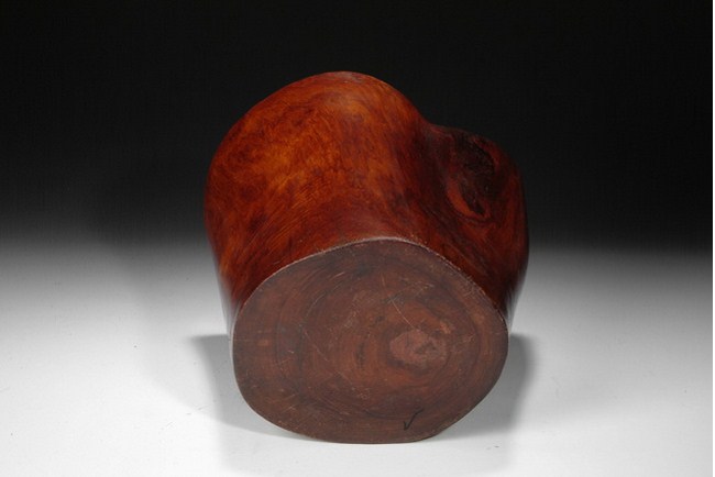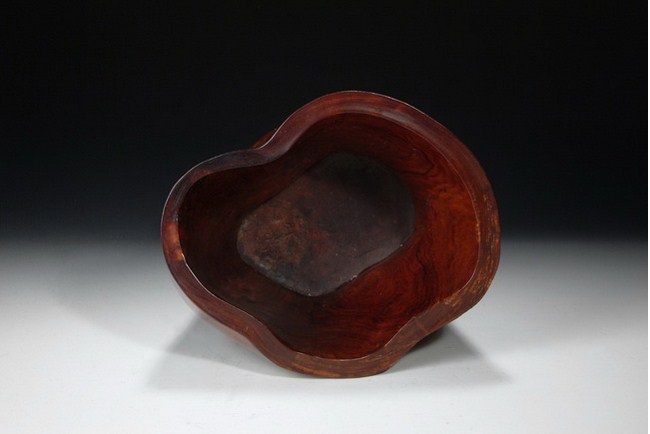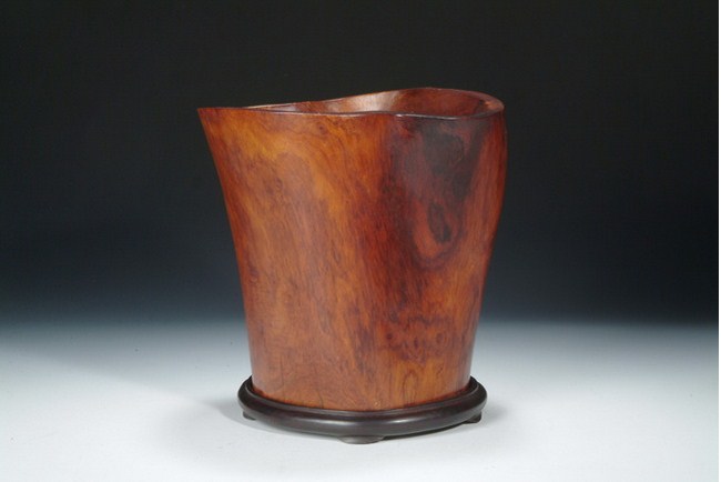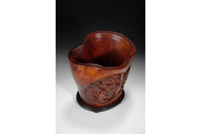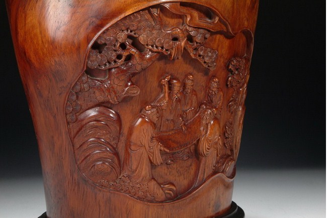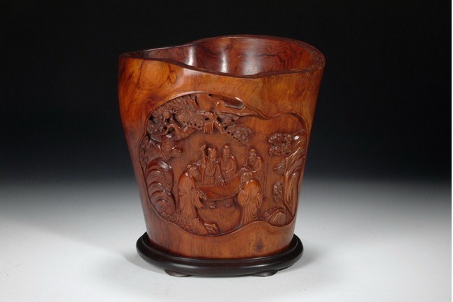 A well carved Huanghuali brush pot depicting five elder scholars appreciating a scroll in a garden setting under a pine tree and next to rock formation. The pot is complete with a Zitan base. 19th Century.
