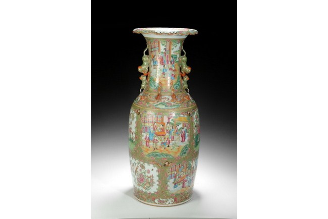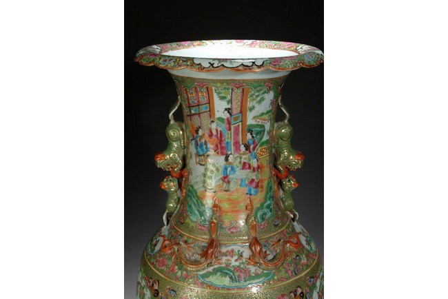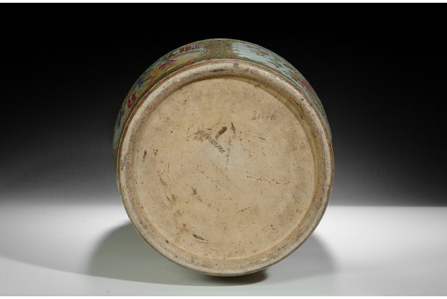 A large Cantonese style famille rose flower vase. The body fully decorated with flowers, birds, and people in the garden settings. Qing Dynasty period.