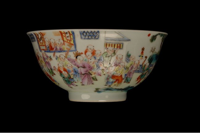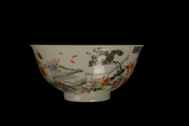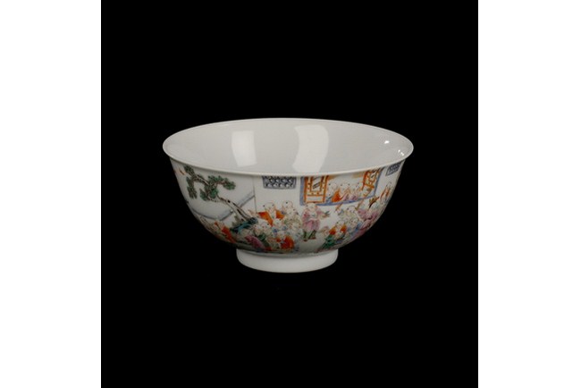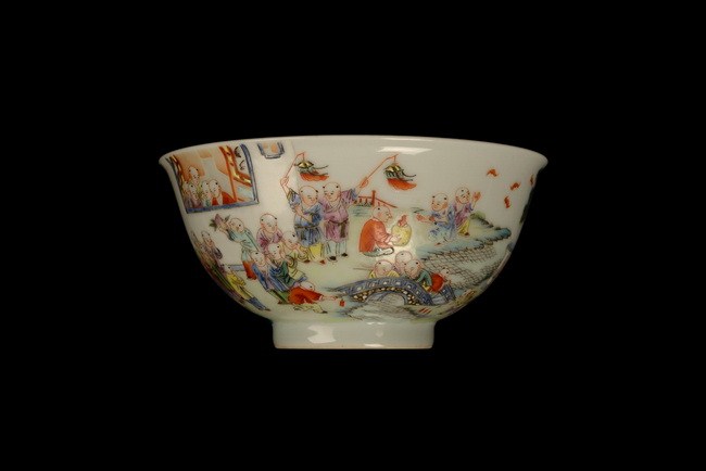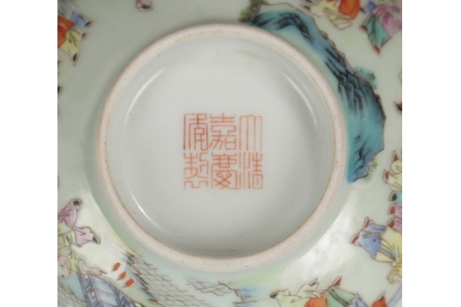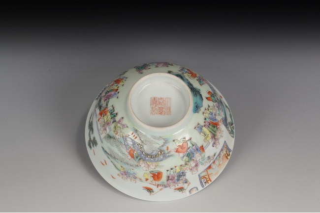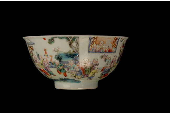 A small famille rose bowls painted with many children playing in a garden setting, symbolizing fortune. Bottom bears six character "JIAQING" mark. Qing Dynasty period.