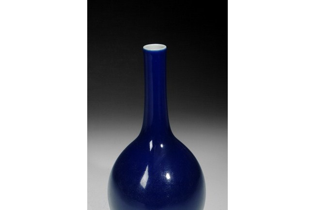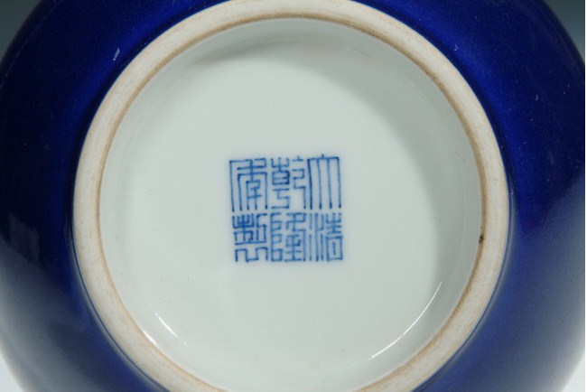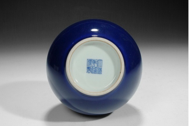 The bottle vase glazed in brilliant blue color, with ovoid body and tapering neck, the base partially covered with a white-tinted glaze, and bears a six character "QIANLONG" mark. Qing Dynasty period.