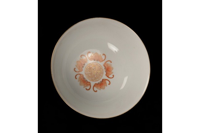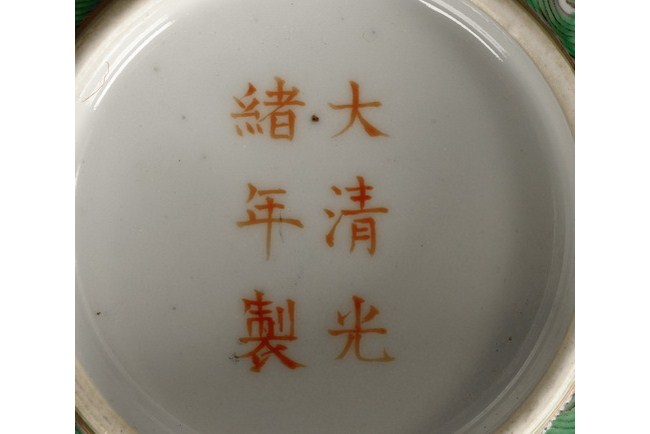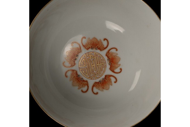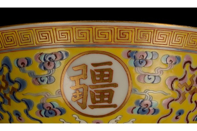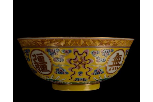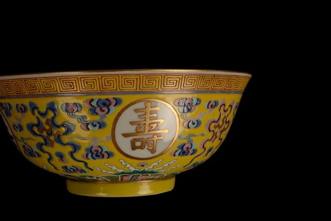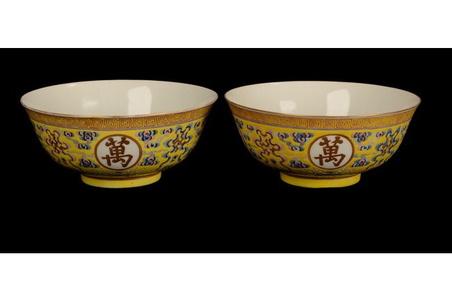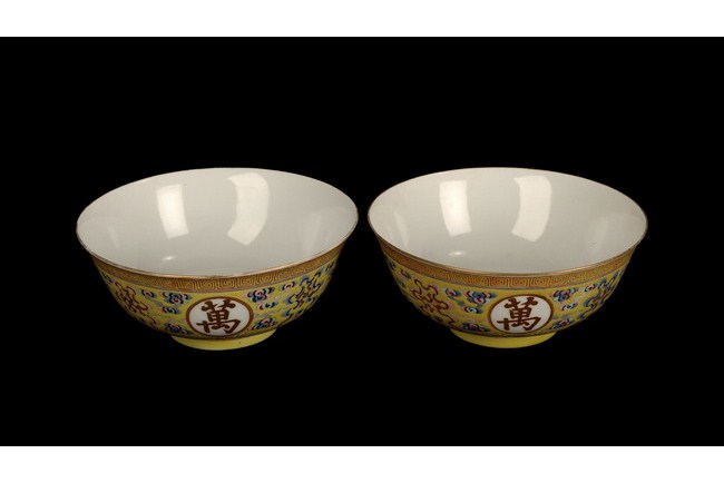 A pair of well potted bowl with enamel designs of four characters "WAN SHOU WU JIANG", celebrating longevity. The bowl is covered in yellow ground, leiwen patterns at the rim. The base bears a six character "GUANGXU" mark. Qing Dynasty period.