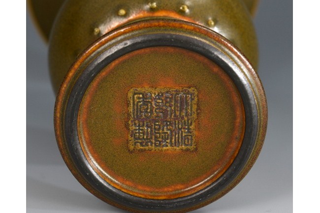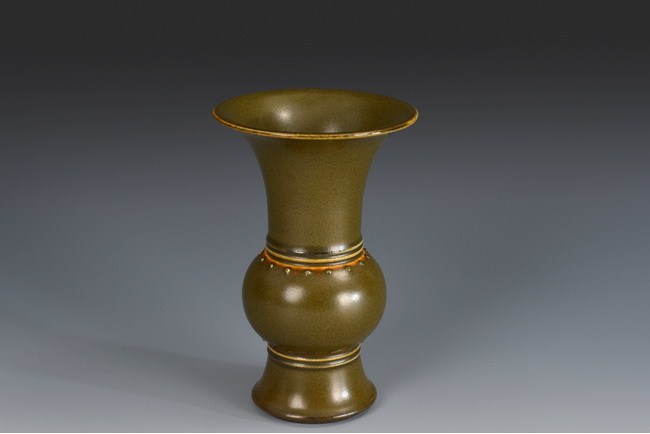 A small Gu style vase, covered overall with tea dust glaze. The vase stands on a round base, extends to a bulbous body, rising to an expanding neck, finally opens to a larger everted rim. The base bears a six characters "QIANLONG" mark.