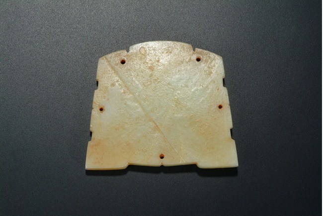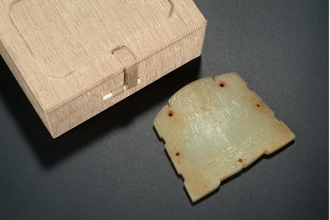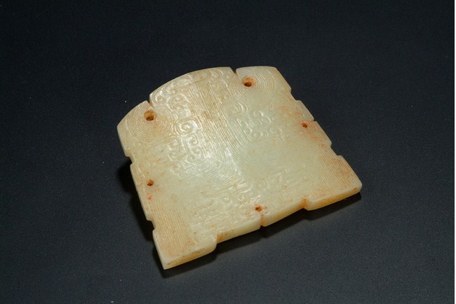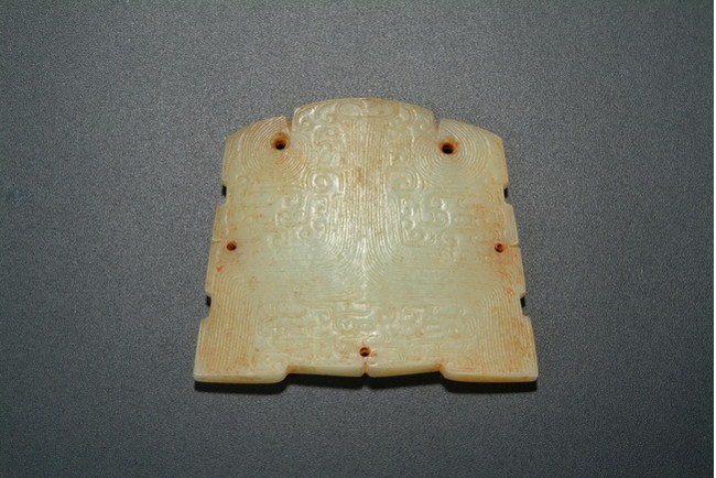A white jade plaque carved in the style of Spring and Autumn period with Taotie pattern. Between Tang and Song Dynasty period.