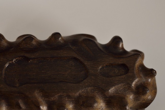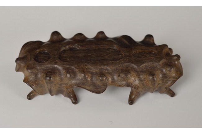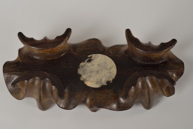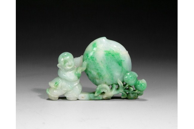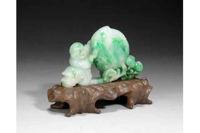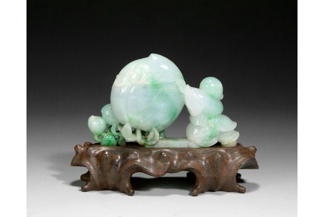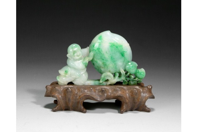 A jadeite decorations carved out of a natural jadeite stone depicting a child and a peach branch. The stone suffused with patches of natural green color, and it is completed with a well carved horn stand. Qing Dynasty period.