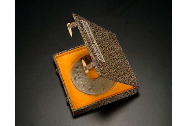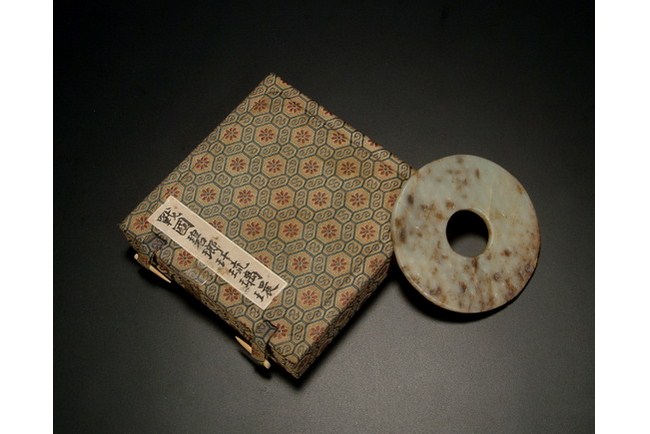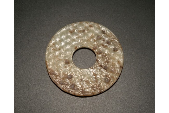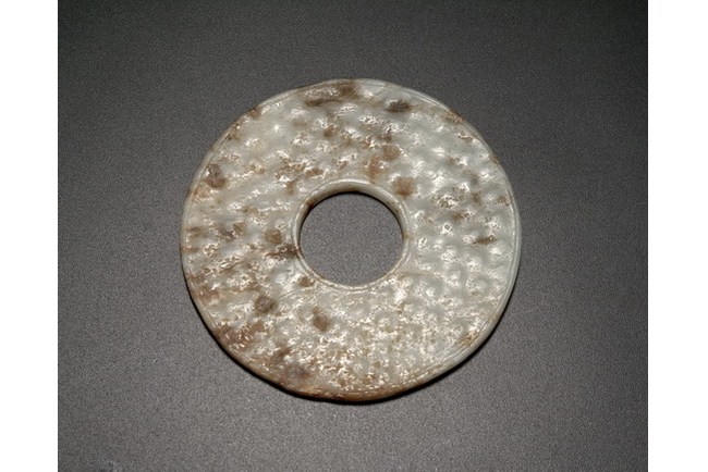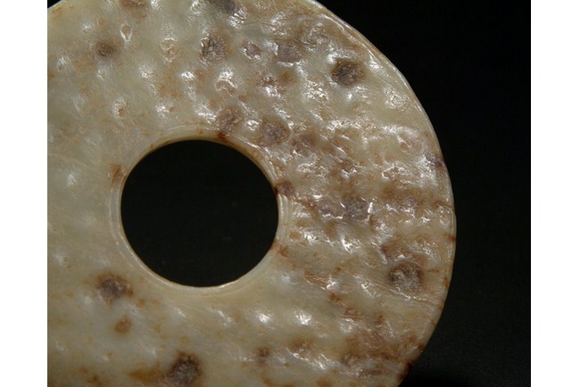 A Han jade Bi with the grain design, and the piece is stained in spot brown color due to long period of burial. Warring States period.