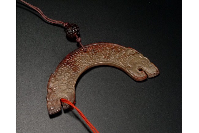 A carved archaic jade Huang in the shape of a twined dragon, and the body decorated with connected cloud pattern. Warring States period.