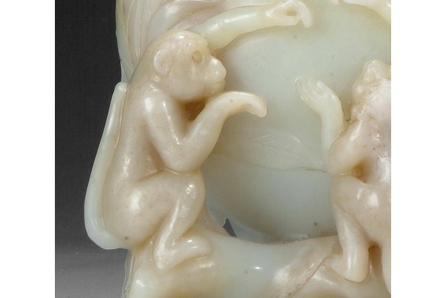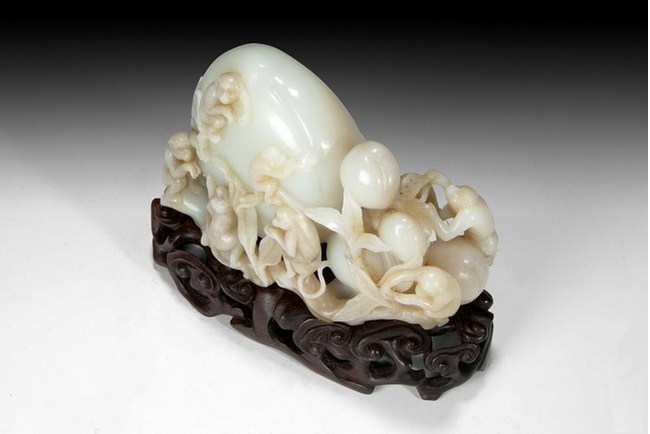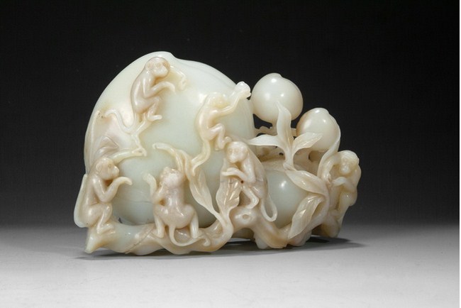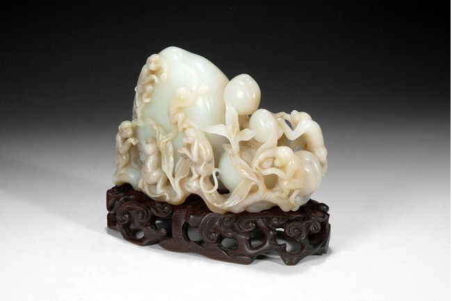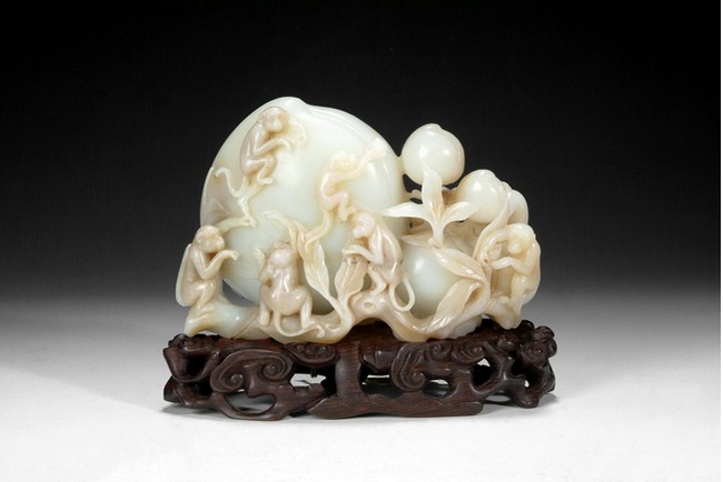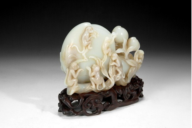 The white jade carving of nine playful monkeys among four peaches. The carved peach branches curved in the bottom to form a loop base. The piece is completed with a Zitan carved base. Republic period.
