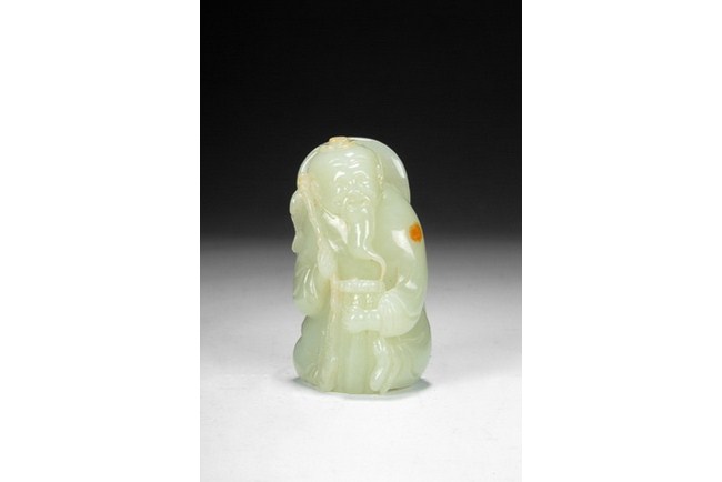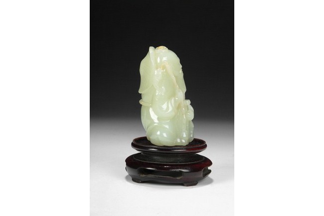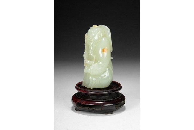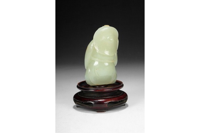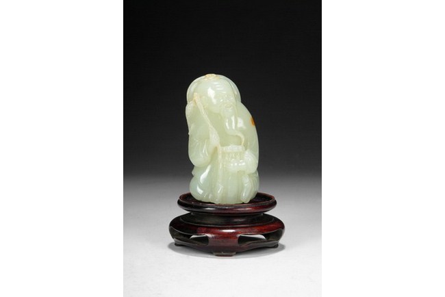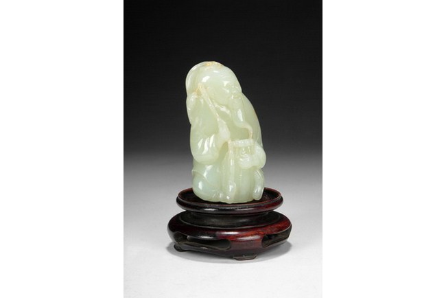 The intricately carved jade figure depicts a smiling elder fisherman, holding a fishing pole in one hand and fishing basket in other. The figure is completed with a wood stand. Qing Dynasty period.