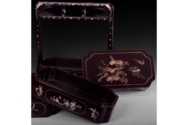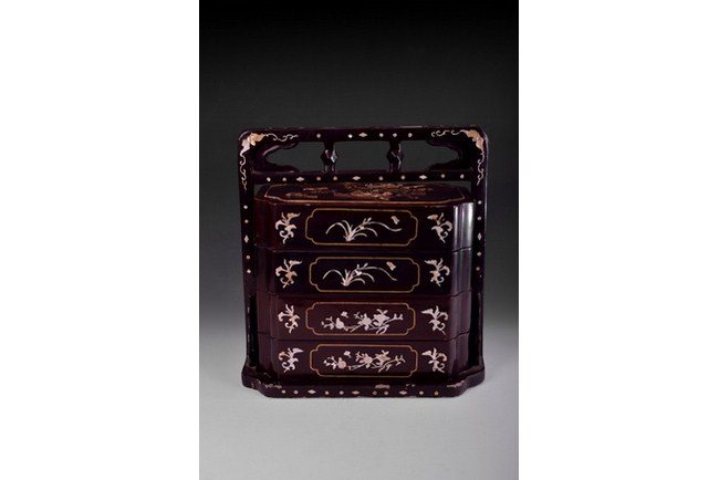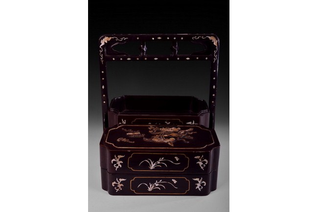 A four sectional wood carrying basket, inset with mother of pearl, depicting various flowers and bat patterns. Qing Dynasty period.