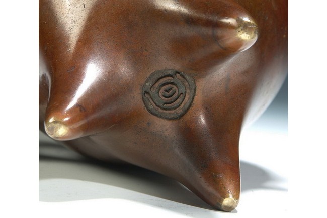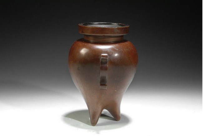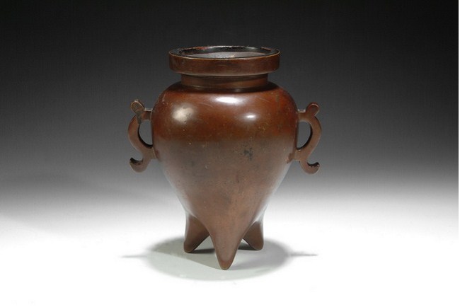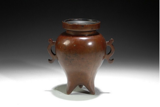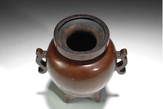 A bronze censer with two animal ear handles attached. The body has a raised rim, and rest on three legs. The bottom bears a one character mark of "XUAN". Qing Dynasty period.