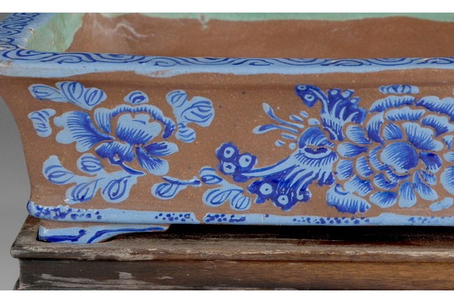 A Zisha narcissus pot, accented with enamel flower designs and is complete with a wood base. Republic period.