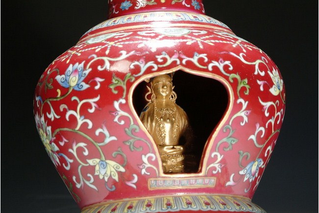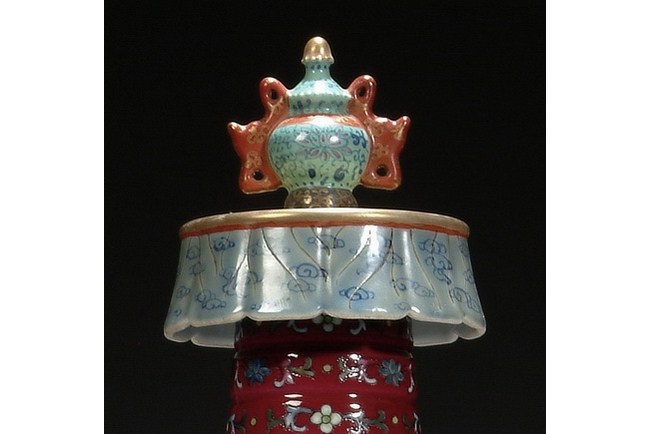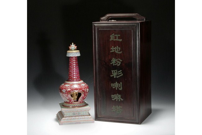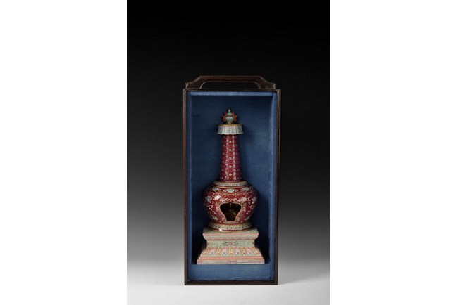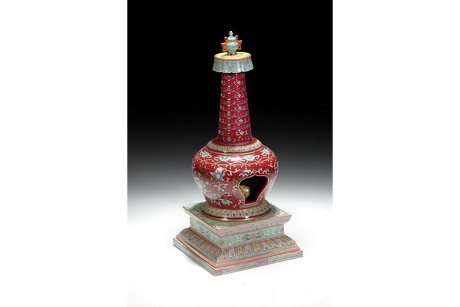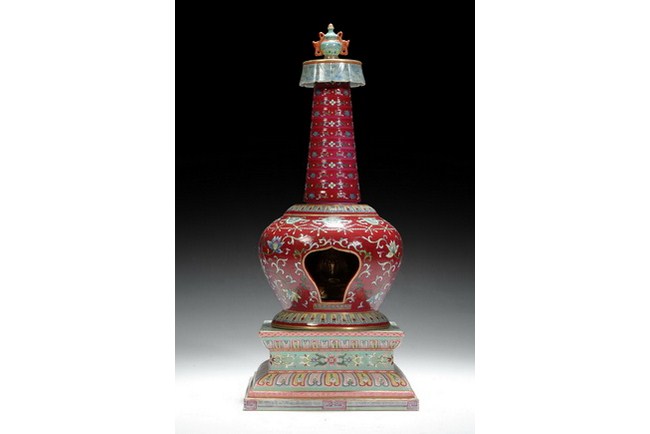 The shrine is superbly modeled and enameled against a brilliant ruby-red ground with stylized lotus blooms borne on multi-hued vines issuing smaller flowers below monster masks linked by pendant beaded chains. The stupa is supported on a square waisted base decorated with bands of lappets and floral scrolls on a teal ground. Qing Dynasty period.
