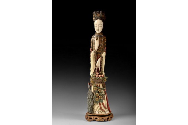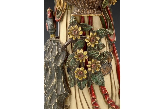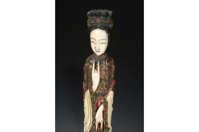 A large carved polychrome ivory Meiren, accentuated with color pigments. The figure is holding a flower basket in one of her hands. It is completed with a hardwood stand.
