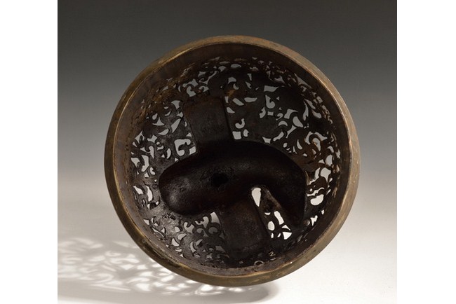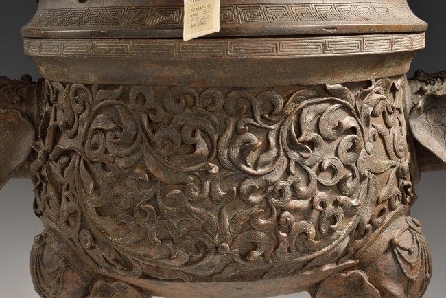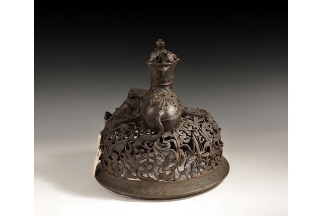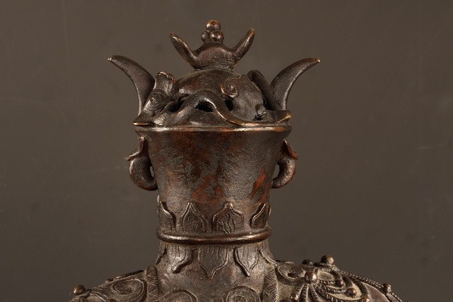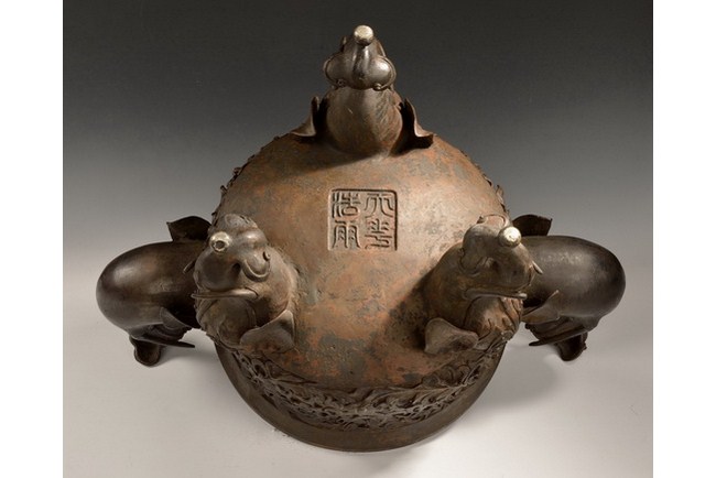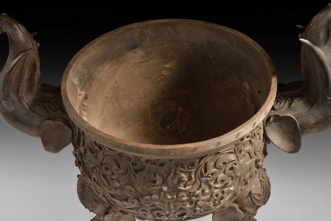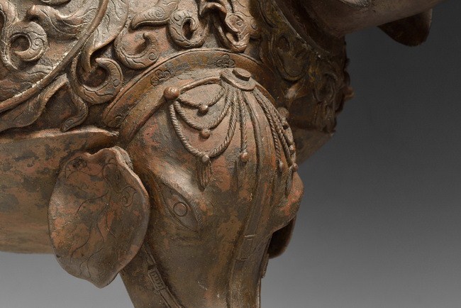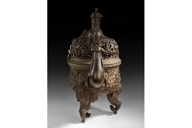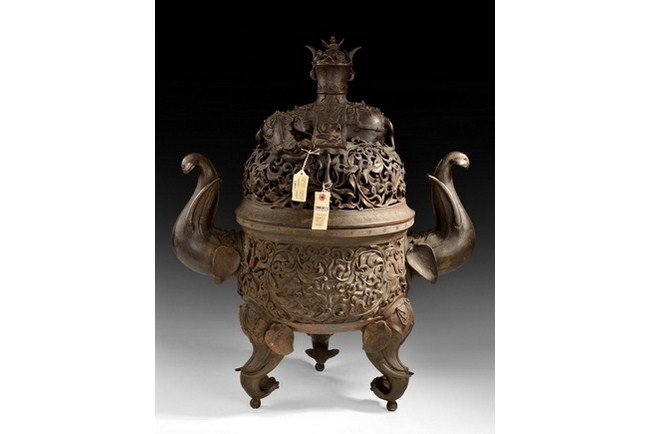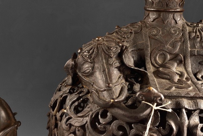 The censer is supported on three caparisoned elephant-head feet and with a pair of similar elephant-head handles, the sides cast in relief with lotus scroll, beneath a border of key fret repeated on the pierced cover, which is also cast with lotus scroll below a recumbent caparisoned elephant supporting on its back a large cylinder containing lingzhi and an ingot laden with three jewels, the base cast with a four character mark reading "TIAN YUN ZAO YU" (Praying for rain). Qing Dynasty period.