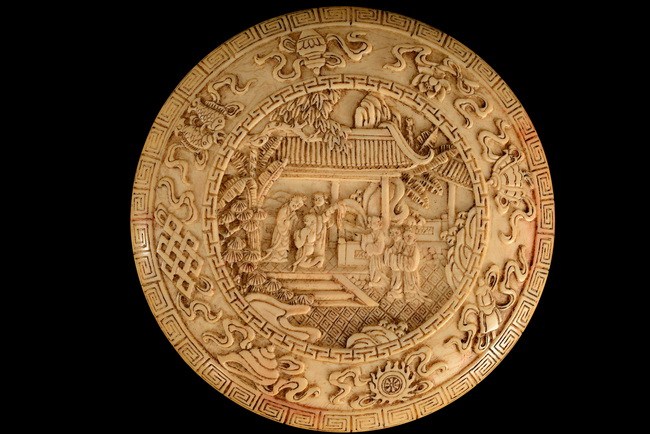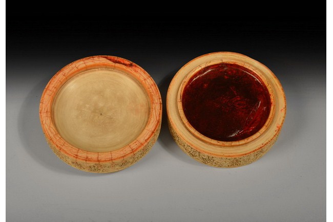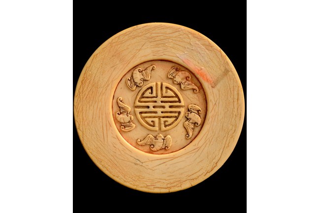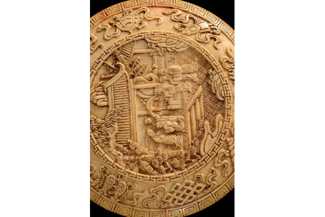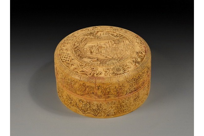 A delicately carved ivory stamp paste box with a scenery of a garden setting and circled by eight precious objects. The side is carved with a continuous band of blossoming flower motifs. Qing Dynasty period.