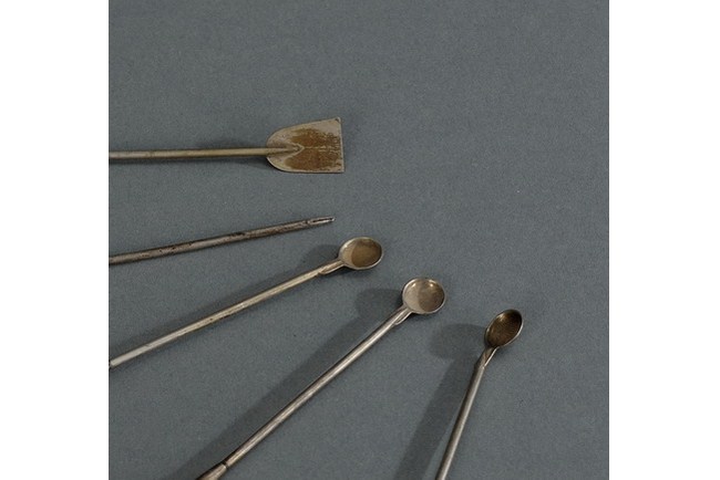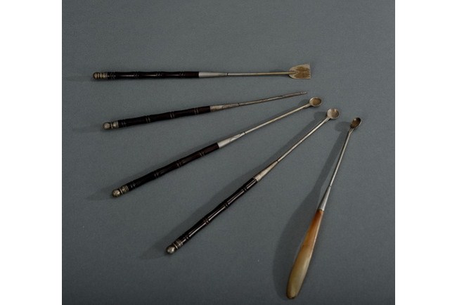 A set of opium implements, consisting of five pieces, each constructed of Bai-tong with Zitan and horn handles. Qing Dynasty period.