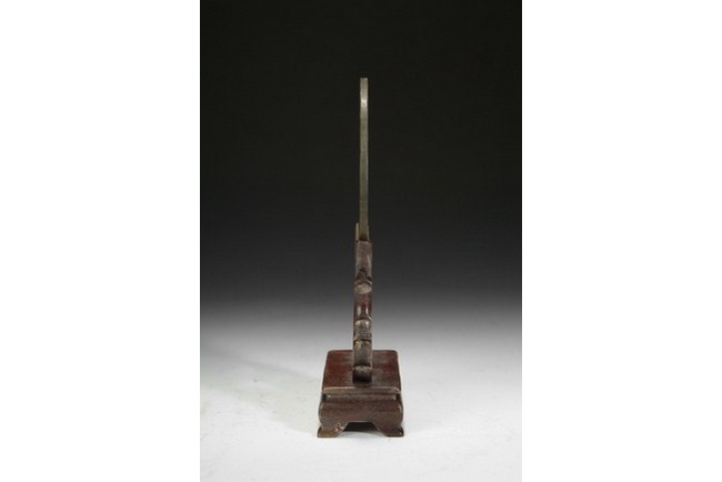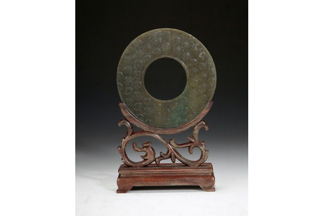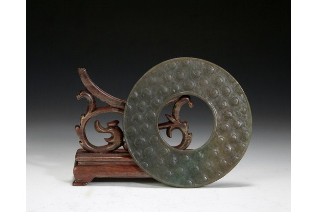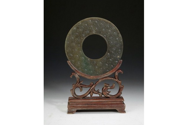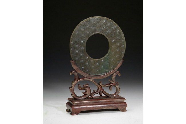 An archaic style celadon jade disc carved in the swirl patterns of warring period. It is completed with a wood stand. Ming Dynasty period.