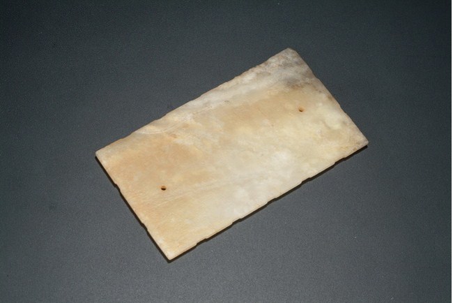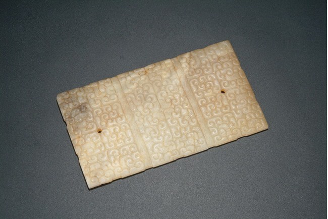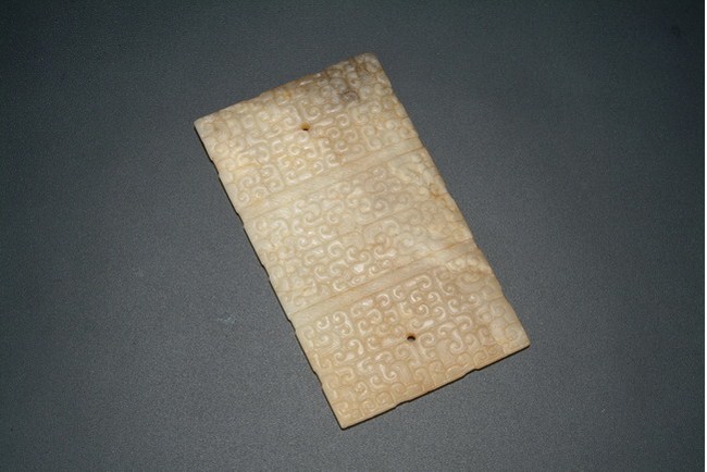An antique jade plaque carved in the style of Spring and Autumn period Chi Long, separate by two twisted robe patterns. Ming Dynasty period.
