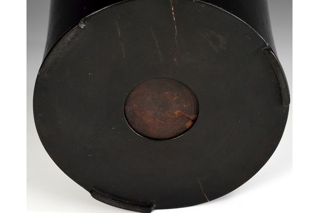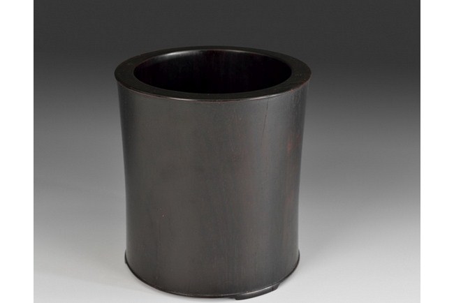A good sized Zitan brush pot with plain design, round shape, and resting on three short legs. It is completed with a wood plug. Republic period.