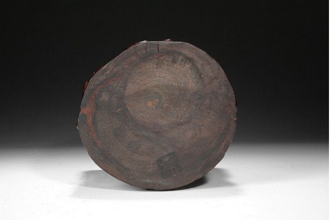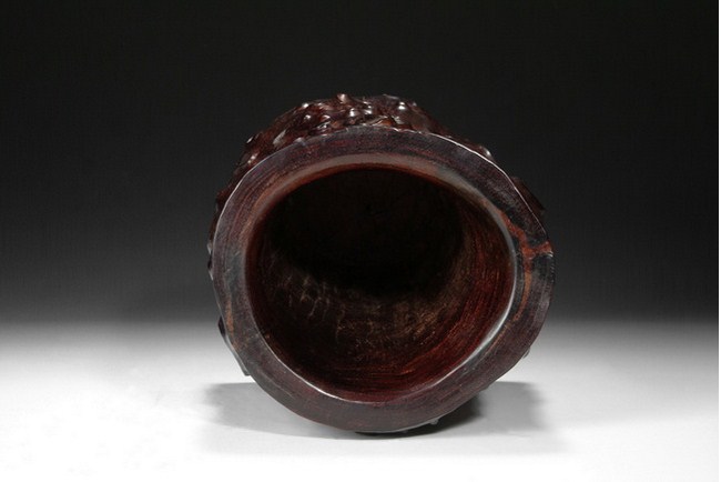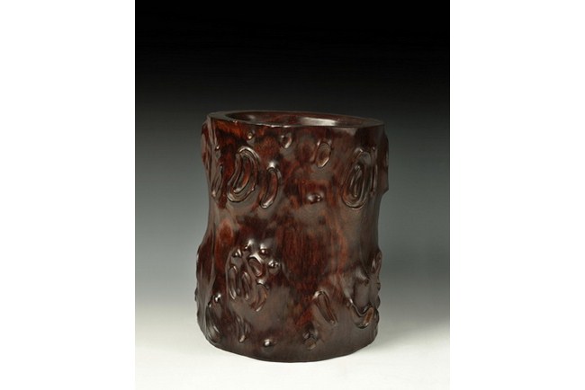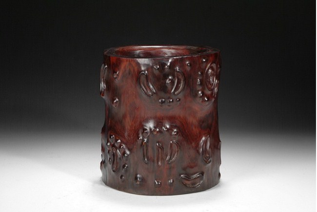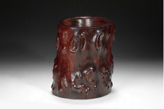 A large brush pot carved out of a single piece of Huanghuali, and in the form of a natural trunk.
