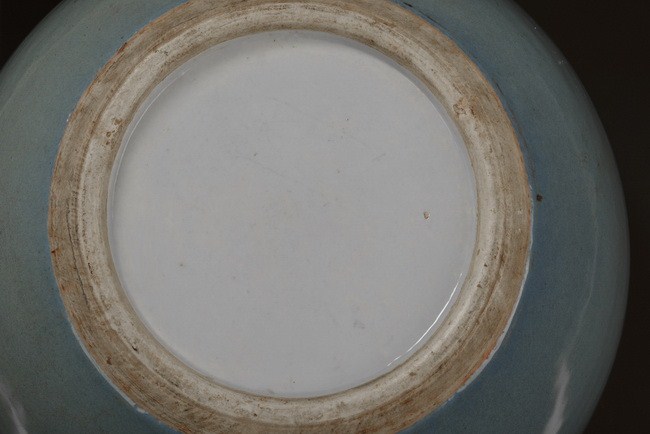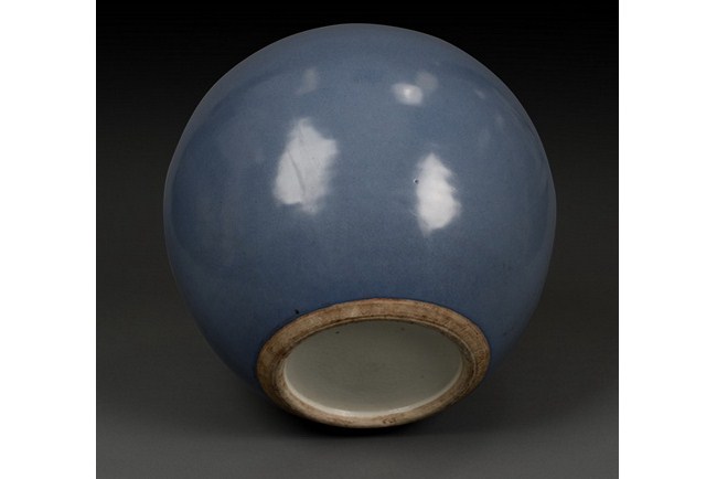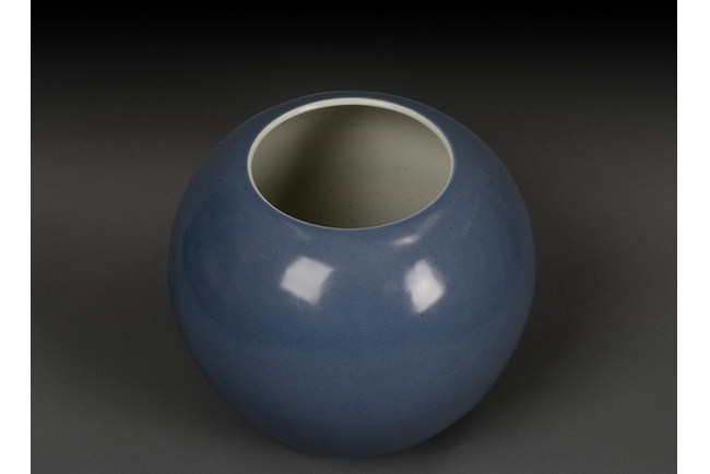 A large bulbous scroll pot glazed overall in blue, with the interior and the base glazed in white color. Early Qing Dynasty period.