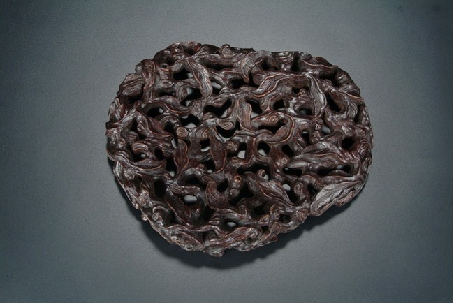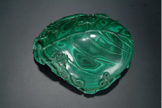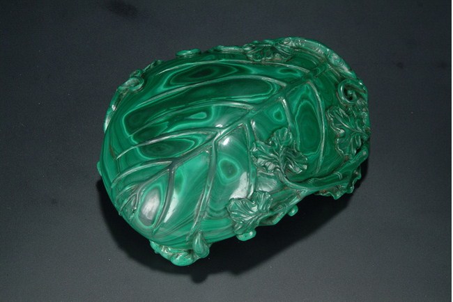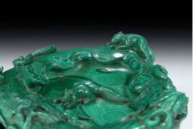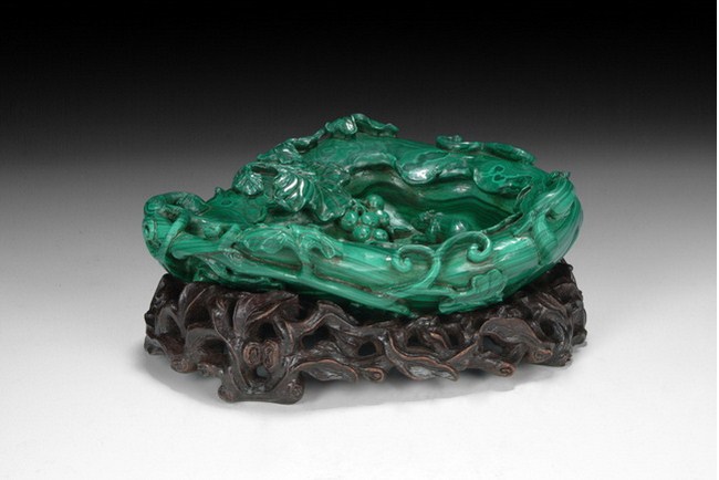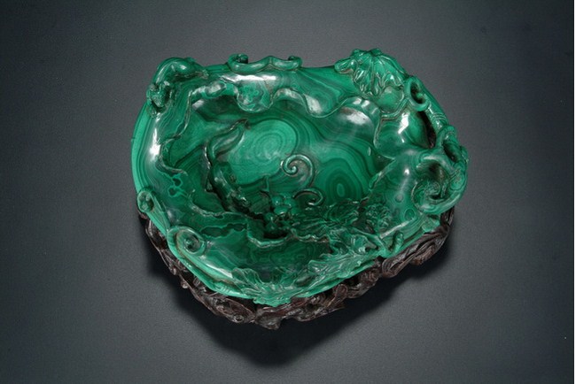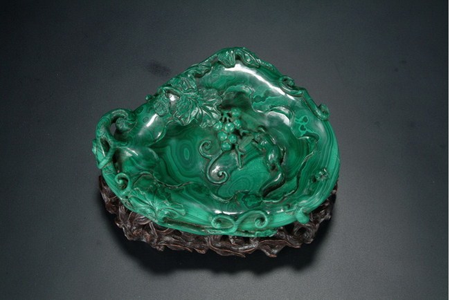 A well carved malachite brush washer depicting grapes, vine, and squirrels, complete with well carved naturalistic hardwood base. Republic period.
