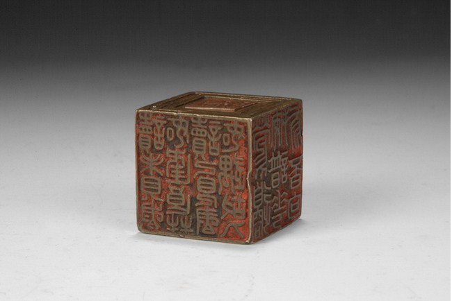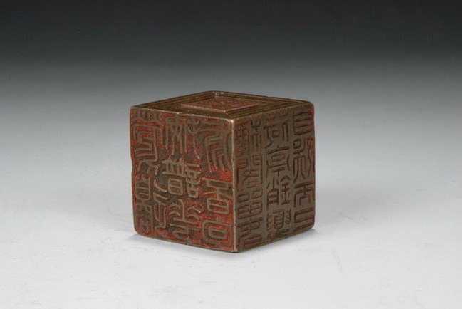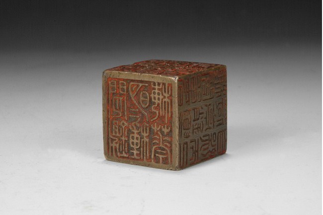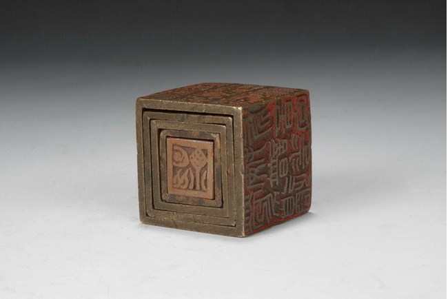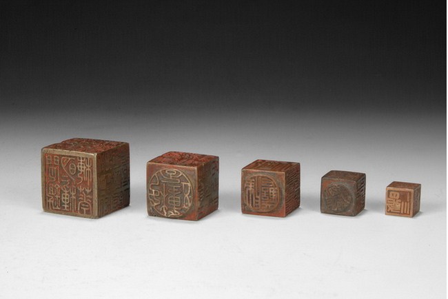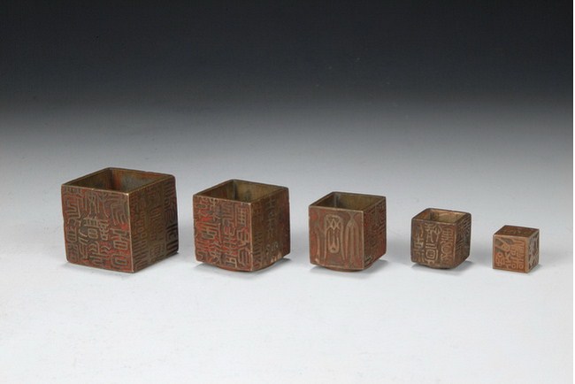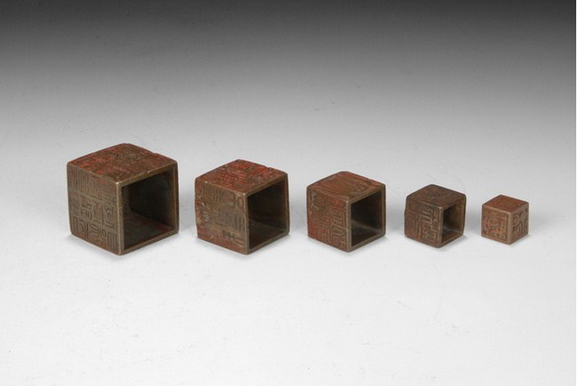 An archaic bronze seals consisting of five interlocking scholar seals, each inscribed with Chinese characters on five sides except the smallest seal, which has all six sides inscribed. Song Dynasty period.