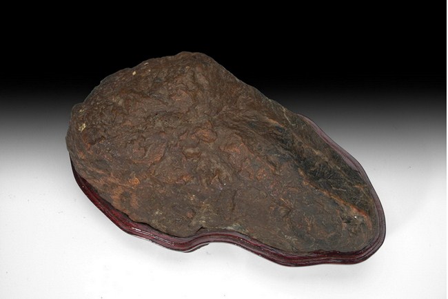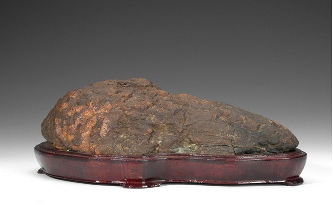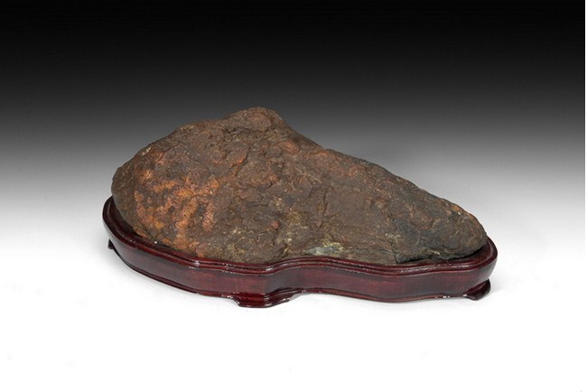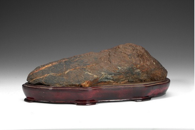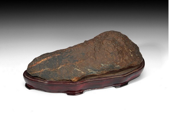 A scholar viewing rock, in the shape mountain, with varying shades of brown and black color. It is completed with an original wood base fitting the base perfectly.