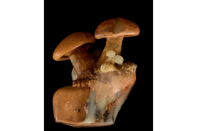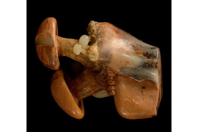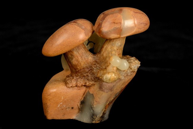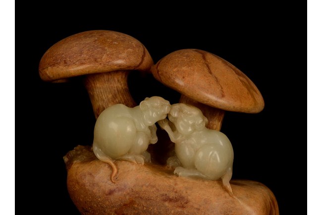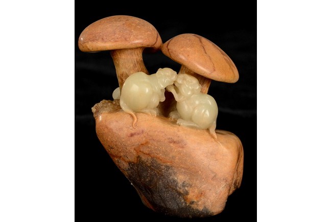 A Shoushan stone carved stamp with two pairs of mushrooms and a pair of squirrels in delicate use of natural colors. Republic period.