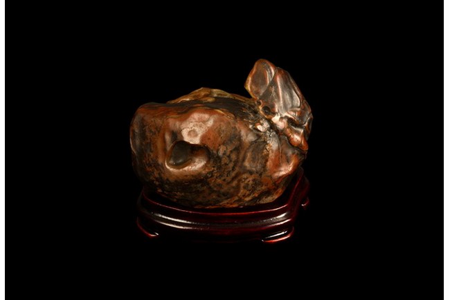 A small scholar rock in the shape of an animal, inset with an original wood base.