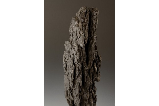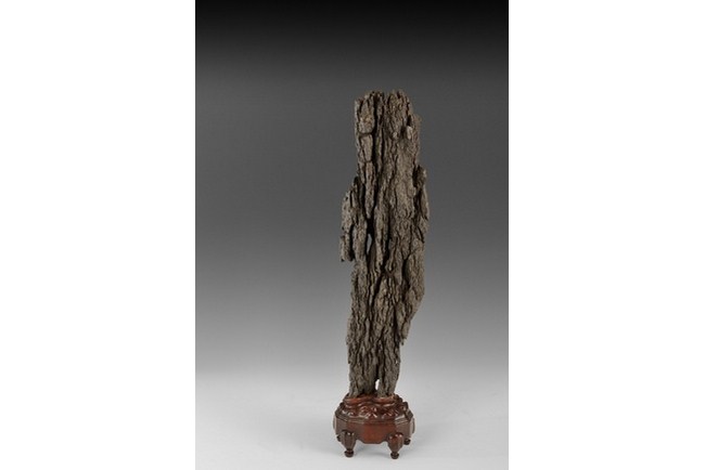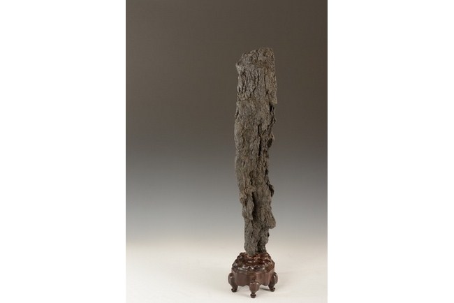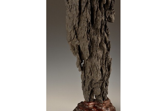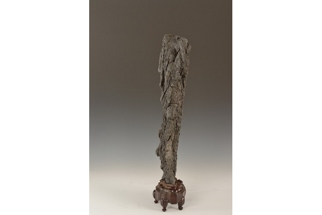 A large Lingbi scholar rocks in the vertical form, resembling a tree trunk, and is completed with wood stand.