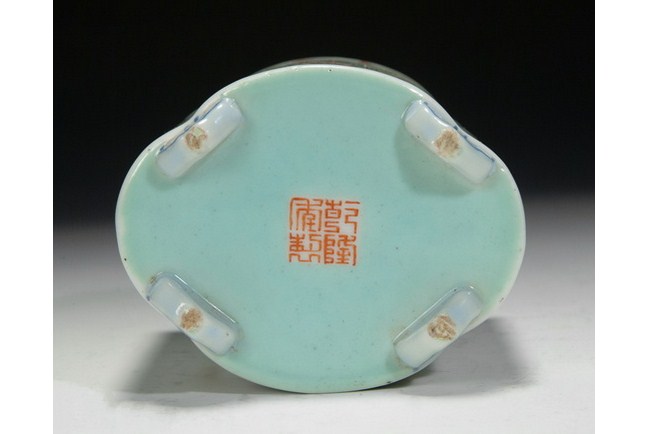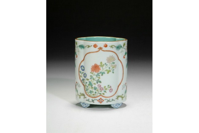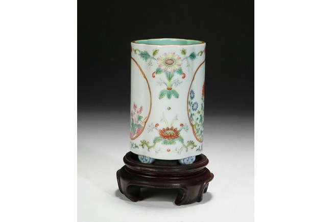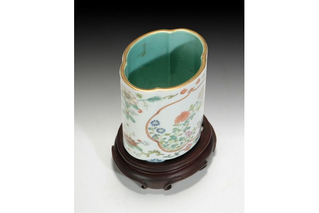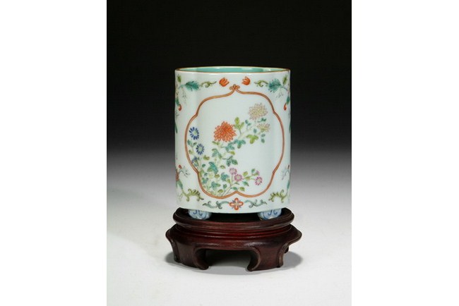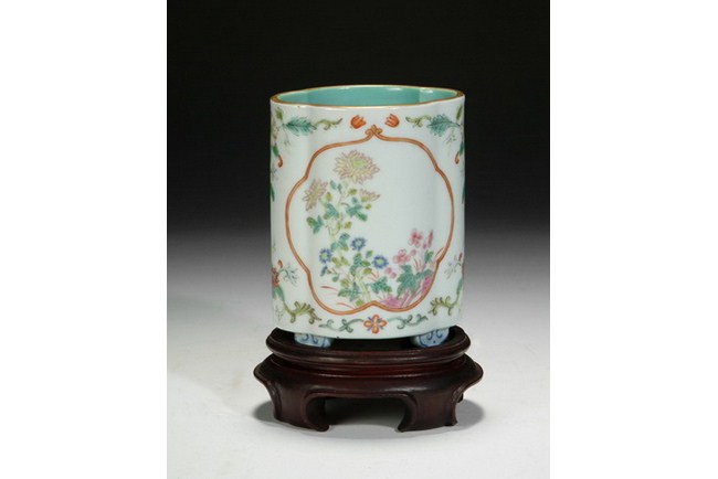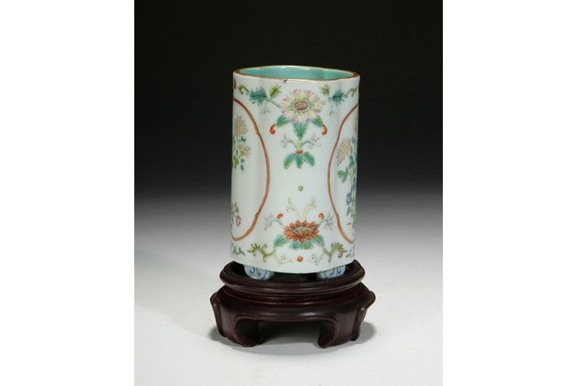 A small famille rose brush pot with design of blooming chrysanthemum. The base bears a four character "QIANLONG" mark.
